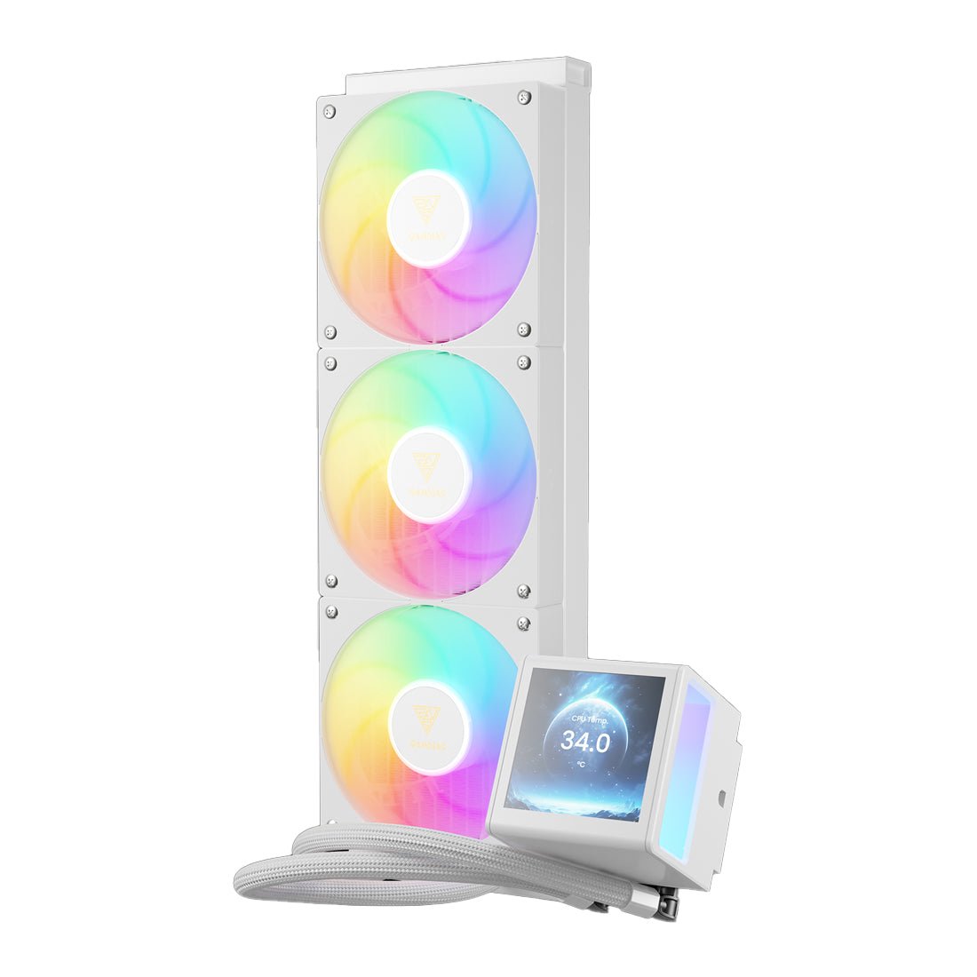 The CHIONE P5-360 WH liquid cooler features a customizable 3.4" IPS LCD display for real-time information, pictures and animated GIFs. Paired with a powerful 360mm radiator and three 120mm ARGB PWM fans, it delivers top-tier cooling performance, ensuring your system stays cool and fashion.